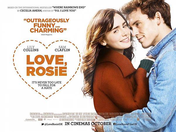 但話說回來,既然片名是Love, Rosie,如同【P.S.我愛你】一樣也是書信最後的署名,這就確實是寫給Rosie的一封情書,莉莉柯林斯在片中的轉折極為漂亮,從無知少女到少婦,再逐漸成為支撐起一家的成熟女人,她變得不一樣,心裡很清楚是無法再擁有愛了,外型卻永遠保持著輕盈可愛,層次多元的演繹真的很迷人。我其實心想,在茱莉亞羅勃茲與珊卓布拉克都相繼轉型、梅格萊恩早已崩壞、瑞絲薇絲朋與瑞秋懷茲早就對愛情喜劇沒興趣、凱薩琳海格與伊莉莎白班克絲又在接連幾部愛情喜劇的失敗之後宣告上位無望,還真的非常看好未來的莉莉柯林斯,也許她會是下一個美國甜心,也說不定。