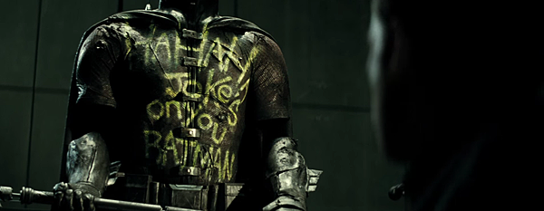 布魯斯韋恩與克拉克肯特鬥嘴時還提到「我們高譚市有很多奇裝異服的小丑」,似乎直指著小丑在他這半生所造成的傷痛,目前也確定小丑會在【自殺突擊隊】、【蝙蝠俠】等電影當中登場,無論小丑是否就像傳聞中一樣,可能就是「二代羅賓」傑森陶德,都能夠證明小丑是蝙蝠俠最恐懼也最痛恨的敵人。也真的就像圖片中所示"Joke's on you",這陰影的確跟隨他一輩子。