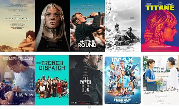 這些電影分別是《上帝之手》、《聖慾》、《醉好的時光》、《茲山魚譜》、《鈦》、《美國女孩》、《法蘭西特派週報》、《犬山記》、《犬山記》、《脫稿玩家》以及《偶然與想像》。
